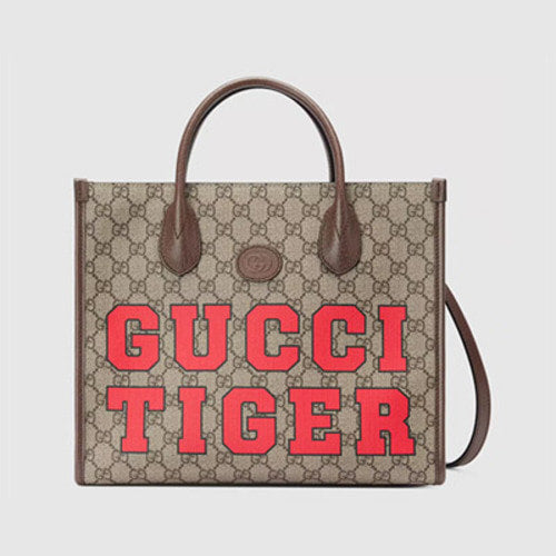 'Gucci Tiger' 모토 프린트가 돋보이는 GG 스몰 토트백입니다 구찌가 2022년 호랑이해를 맞이하여 대규모로 선보인 타이거 컬렉션 중 하나로 현대적인 감성의 타이거가 컬렉션의 로고 프린트와 결합되어 하우스의 과거와 현재를 연결하는 디자인을 만나볼 수 있으며 크리에이티브 디렉터의 컬렉션에 자주 등장하는 펠린이 자연 세계 그대로의 아름다움에 대한 하우스의 열정을 표현하였습니다 부담스럽지 않은 크기에 다양하게 매치가 가능하면서 가방 하나만으로 멋스러운 포인트를 주는 패션 아이템입니다